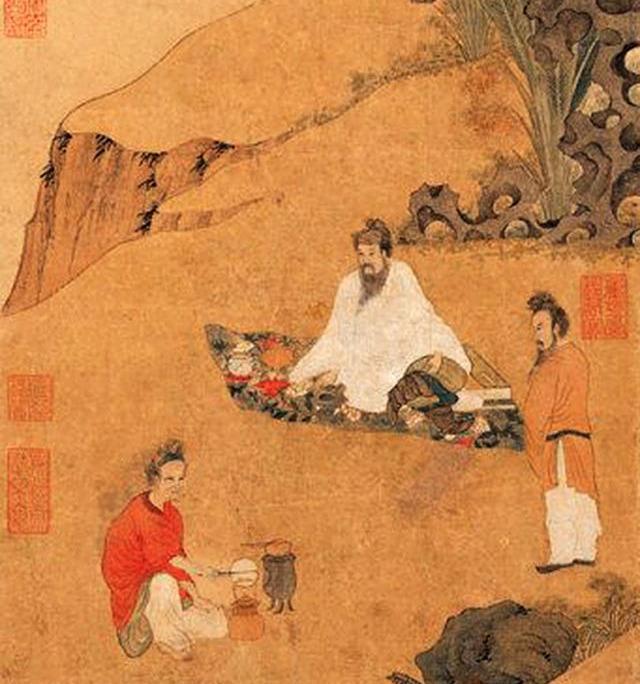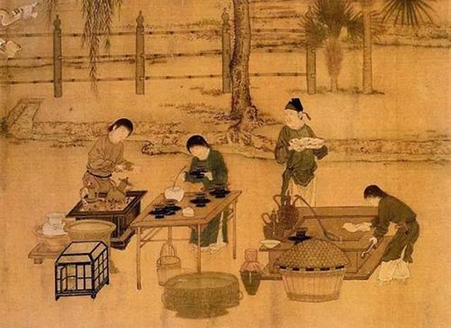 南宋时期的画家刘松年创作的代表作《撵茶图》中展示了这样的场景,一名仆人正专心致志的磨茶,也就是将茶饼碾碎到足够细腻,茶几上整齐摆放着众多茶具,另一人正专注泡茶。此外又有一名僧人正伏案作文,左右各一人也是姿态放松,正享受这场茶会。